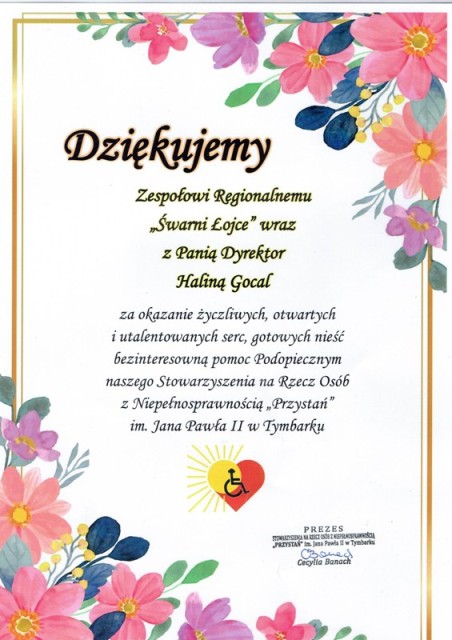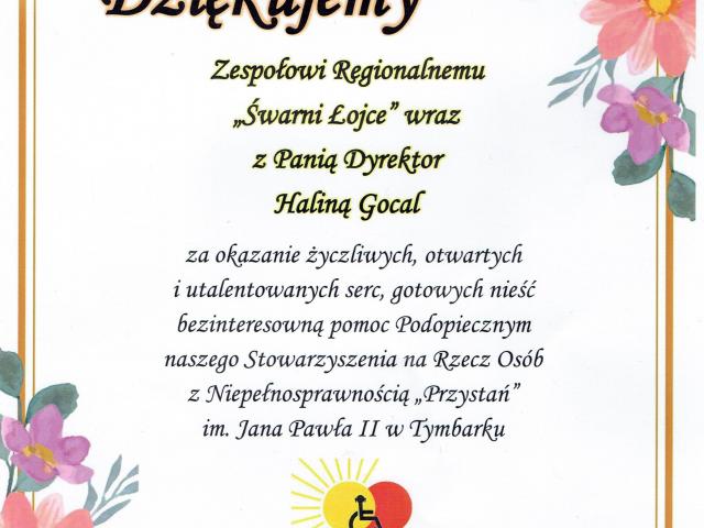 Podziękowania dla „Śwarnych Łojców” od Stowarzyszenia na Rzecz Osób z Niepełnosprawnością „Przystań” z Tymbarku